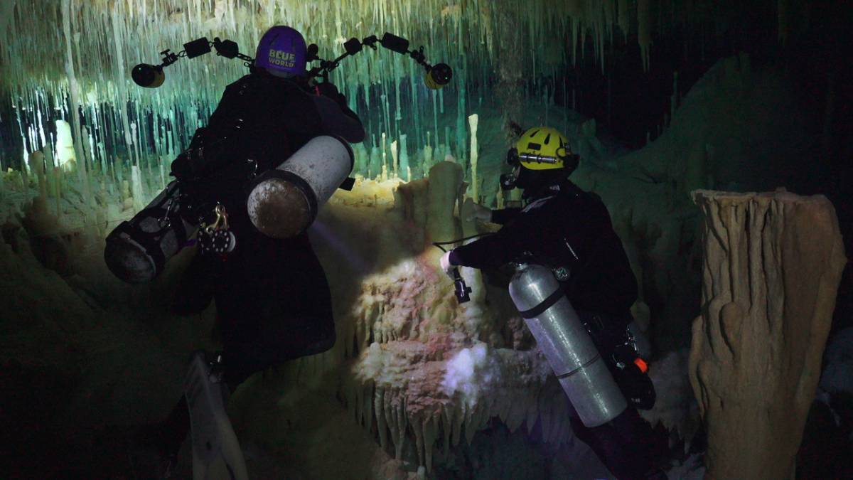 Cave diving is considered an extreme sport because of the obvious danger of being in a place where there is no light, no air, and no way to get to the surface for air in an emergency. In the scuba diving world, if you are in a cave yet you can still see the light from the opening, or if the cave is only half full of water so you can surface and breathe, you are not technically cave diving, but cavern diving. Most of the segments we have done on Blue World where we are filming in a cave, were technically, by scuba standards, caverns, not full caves. (This fine distinction is sort of lost on the general public, so we don't generally get into that level of detail in a Blue World episode). Furthermore, being the host of a TV show does have advantages--when our team shows up to film, we always have lots of local experts helping us out. Whenever we are filming in a fragile cave-like environment, we have a cave instructor with us who serves as our guide. Not only does he or she make sure we get the shots we need, but also makes sure we get back out!