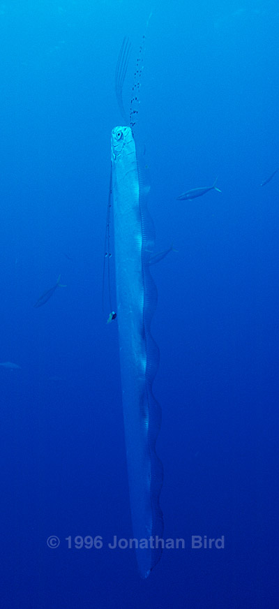 Several new pieces of scientific information were learned about this fish from my brief encounter. Previously, all the information available came from dead specimens. In observing a living animal, I discovered that the fish swims with undulations of the dorsal fin only, not the entire body. I also found that the Oarfish seems to prefer a vertical orientation in the water column. The way in which it holds its pelvic fins was not known before, and the coloration of the fish (very silvery) was different than seen in dead specimens.