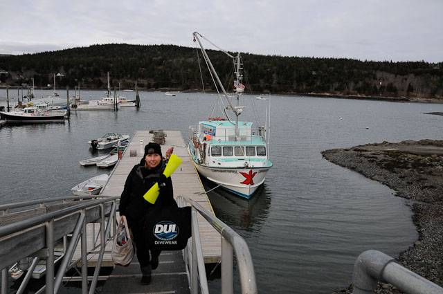 Diver Ed Monat has been going out and getting great interactions with the seals so he invited us on a trip last weekend. The weather was looking really good. Julia, Editor Tim and I drove up to Bar Harbor and went out early with Diver Ed and his wife "Captain Evil" Edna. Also on the expedition was film maker Nick Caloyianis and photographer Mauricio Handler. We left the dock at 5:30 AM and were out at the rock before 8 AM, so we had a good long day to work with the seals. The water was 40 degrees (chilly!) and my first dive with Julia was 75 minutes. The camera batteries were not really happy about the temperature either. They were not lasting as long as they should. Time for new batteries. I was warm except for my toes when I got out, but unfortunately, the seals were not playful. They would swim by, about 10 feet away, stare at me, but would not come over and play. I did a quick battery change on the camera, a tank change, and went back into the water for a second dive. The dive lasted 90 minutes. I did something I rarely do, which was call the dive due to being cold. I still had camera battery power and plenty of air (the dive is 10-15 feet deep, a tank lasts a while!) but my toes were so cold, I couldn't feel them! By the time I got to the dive ladder, I had to be careful climbing it because I couldn't tell if my feet were actually on the rungs they were so cold!